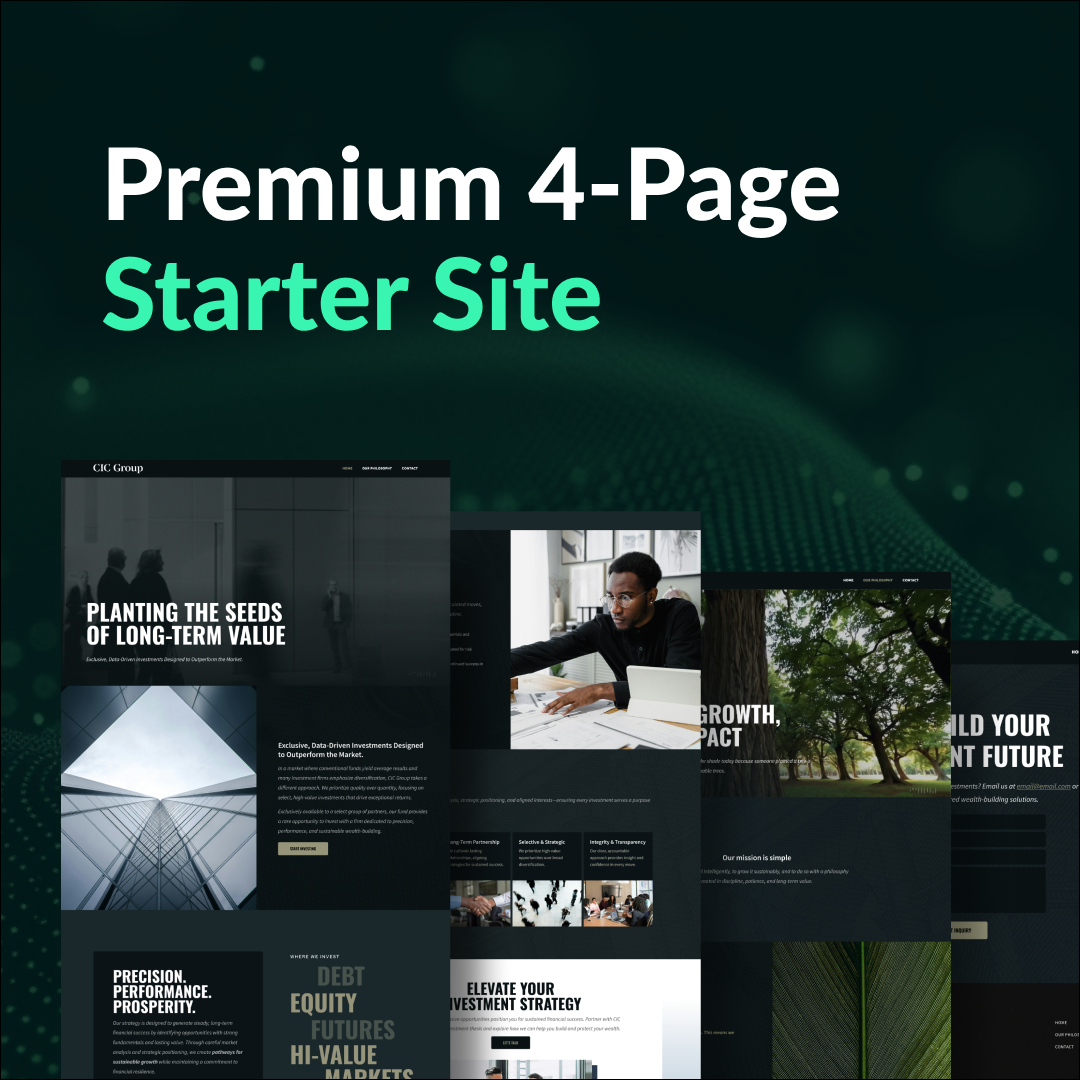 A professional starter site with 4 custom pages (Home, About, Services, Contact), responsive layouts, and SEO setup. Includes a branded email signature, 6 social media launch templates, and a 5-email nurture sequence so you can build credibility and attract leads from day one.